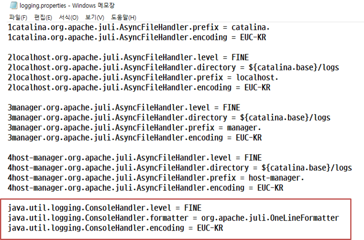 코드 하단에 "java.util.logging.ConsoleHandler.encoding = UTF-8" 부분