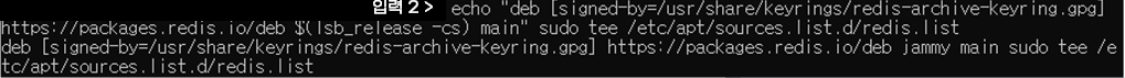 echo "deb [signed-by=/usr/share/keyrings/redis-archive-keyring.gpg] https://packages.redis.io/deb $(lsb_release -cs) main" sudo tee /etc/apt/sources.list.d/redis.list https://packages.redis.io/deb jammy main sudo tee /etc/apt/sources.list.d/redis.list